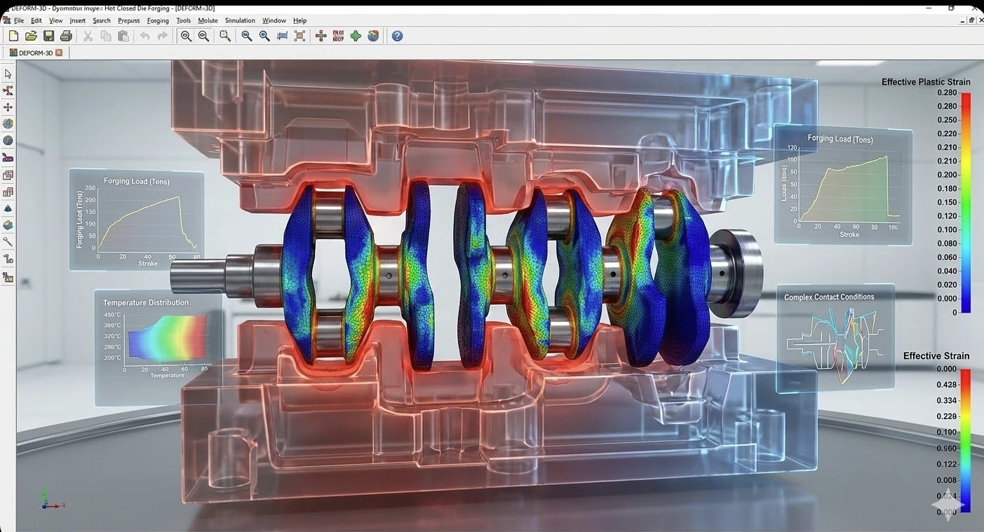 Приложения по индустрии DEFORM е доказано решение в широк спектър от индустрии. В аерокосмическата промишленост се използва за симулация на критични компоненти от титан и никелови суперсплави — турбинни дискове, лопатки и конструктивни елементи. В автомобилния сектор осигурява оптимизация на процесите за производство на колянови валове, мостови плочи, съединителни биели, зъбни колела и окачвания. В производството на крепежни елементи (болтове, нитове, гайки) позволява предотвратяване на дефекти при студено оглавяване при висока скорост. В нефтената и газовата промишленост подпомага разработването на специализирани фланци и тръбни съединения с изключително прецизни изисквания.