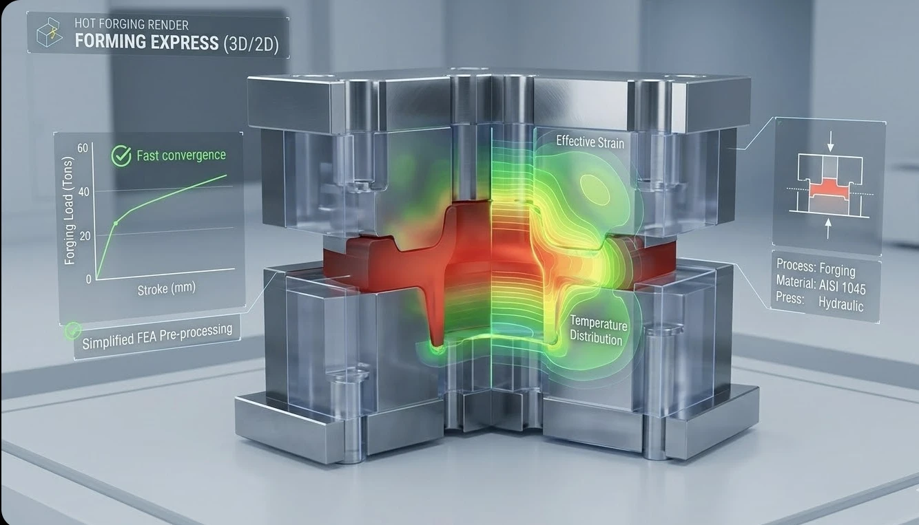 FORMING EXPRESS (3D/2D) – Опростена, лесна за използване версия на DEFORM-3D/2D, насочена към бързо моделиране на стандартни процеси — коване, студено оглавяване, екструдиране, изтегляне и набиване. Подходяща за производствени предприятия, търсещи бърз достъп до симулационни резултати без специализирана FEM подготовка.