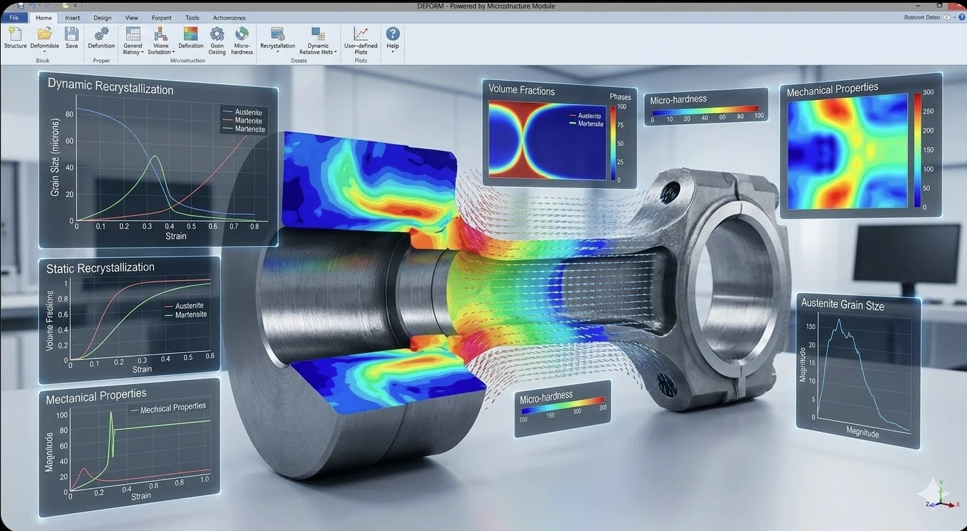 Модул Microstructure – Разширява възможностите на DEFORM-2D и DEFORM-3D с предсказване на микроструктурната еволюция по време на термомеханична обработка. Изчислява обемните дялове на фазите, зърнения размер и механичните свойства на крайния продукт.